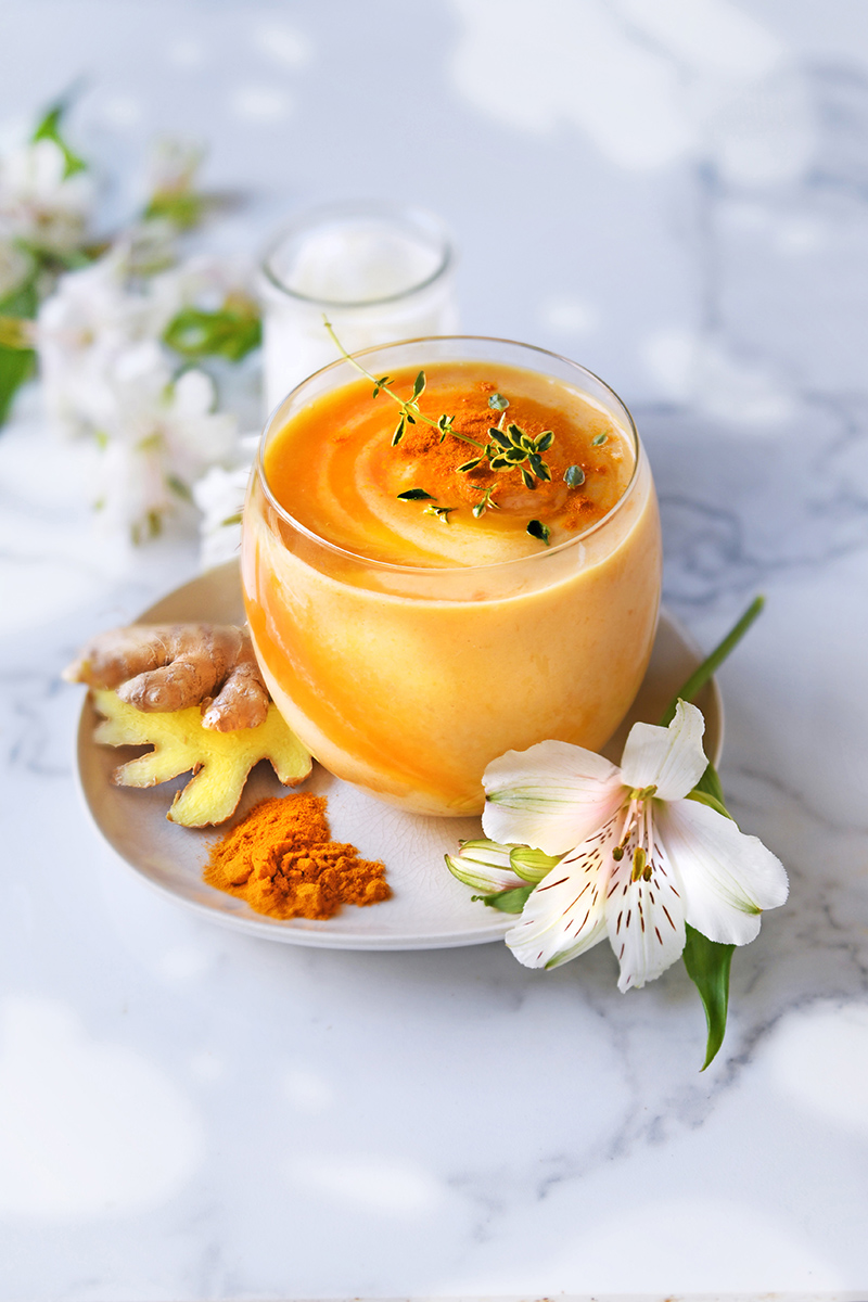 Mettre dans un verre et saupoudrer d’un peu de curcuma et de feuilles de thym citron.