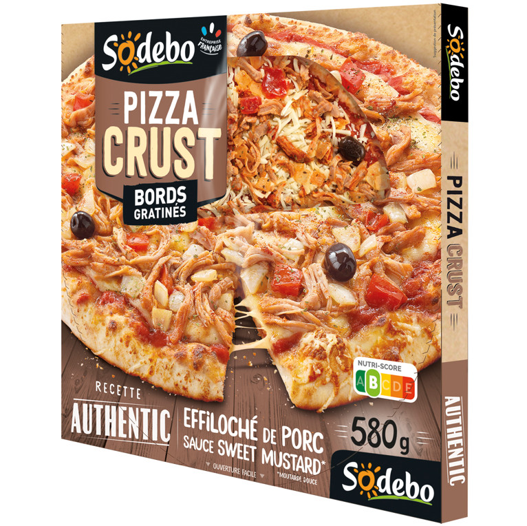 Une recette qui mise sur les saveurs de : mozzarella, effiloché de porc, d’oignons, de crème fraiche légère, de tomates et d’olives noires, réhaussée d’une sauce sweet mustard.