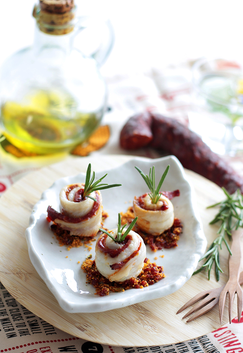 Servir chaque roulé de sole avec un peu de chorizo croustillant, après avoir retiré les cure-dents.