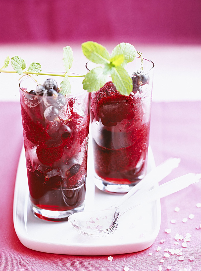 Arroser chaque verre d’un trait de liqueur de cassis et décorer avec quelques grains de cassis et quelques feuilles de menthe.