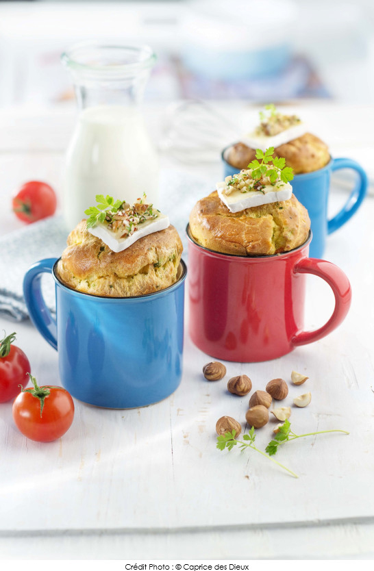 ⑪• Disposer une jolie tranche de Mini Caprice sur chaque soufflé, répartir le mélange de noisettes sur les tranches de fromage.