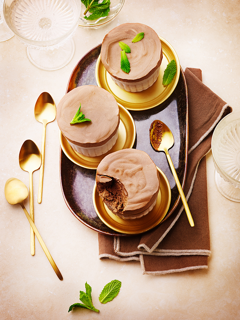 10 minutes avant de servir, ôtez le papier des ramequins, puis décorez la surface de feuilles de menthe et servez.