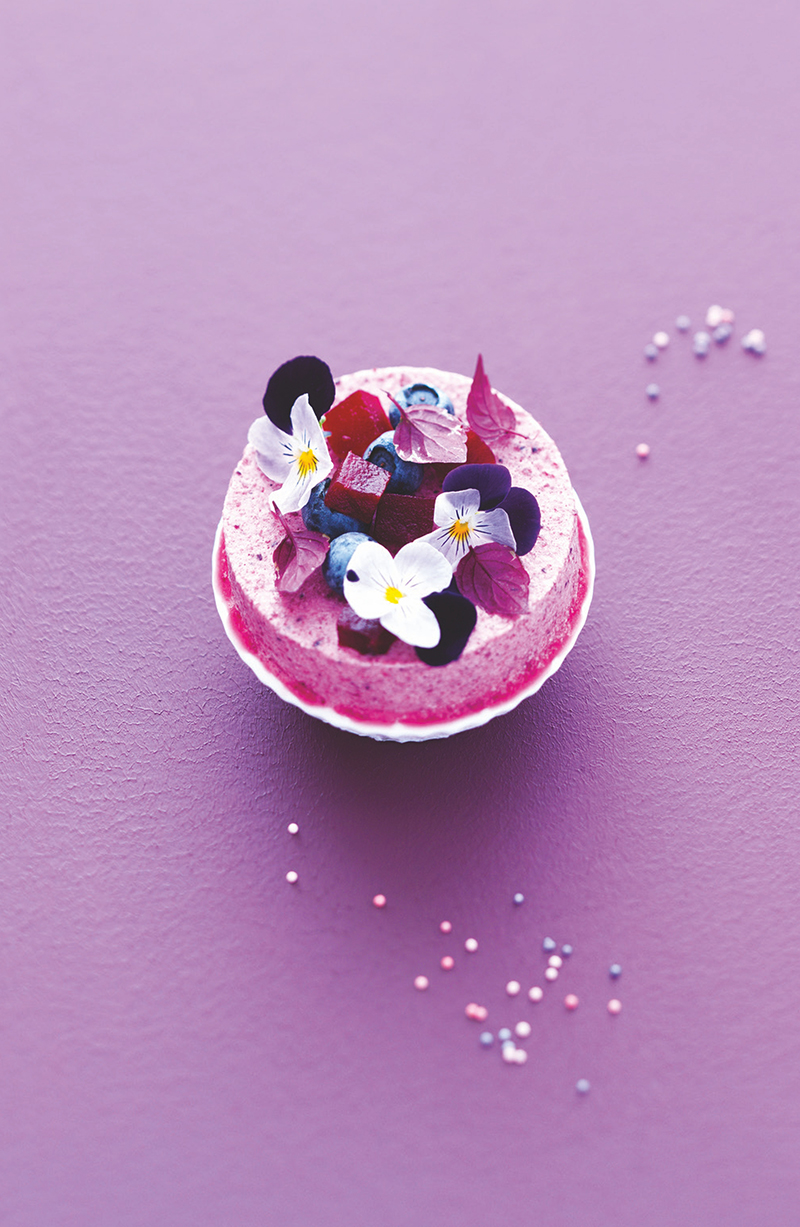③• Parallèlement, préparez la crème fouettée à l’aide d’un fouet dans un contenant bien froid. Incorporez délicatement, à l’aide d’une spatule, la meringue à l’appareil betteraves et myrtilles. Incorporez de la même manière la crème fouettée. Pour le dressage, utilisez des petits ramequins de 8 cm de diam. sur 2 à 3 cm de hauteur. Garnissez chaque fond de ramequin de l’appareil à soufflé, déposez quelques cubes de betteraves et myrtilles au centre. Couvrez à nouveau de l’appareil, lissez jusqu’au bord du ramequin. Posez un cercle du même diamètre que le ramequin sur celui-ci. Rehaussez de crème et lissez. Placez les ramequins au congélateur 2 à 3 heures.Démoulez à l’aide d’un chalumeau ou de la chaleur de votre main les petits cercles qui rehaussent les ramequins.