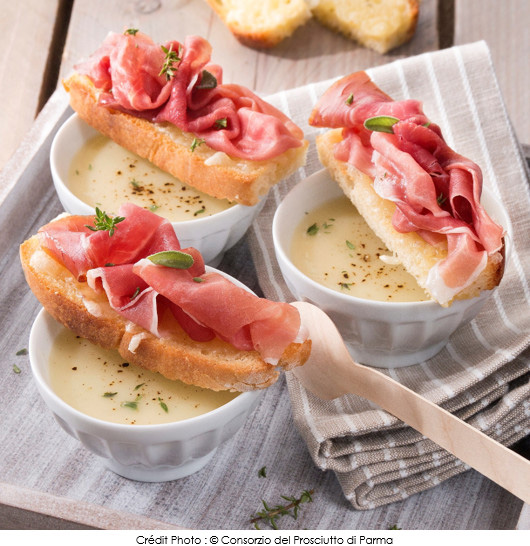 Soupe à l’oignon et aux pommes de terre, tartines de pain gratinées et Jambon de Parme