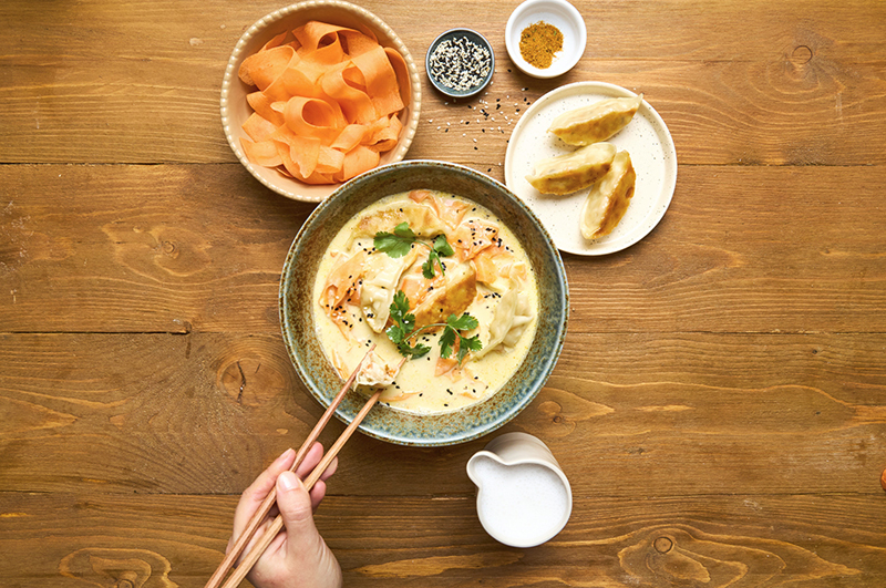 ⑦• Servez la soupe coco dans un bol avec les gyoza. Parsemez de graines de sésame et de coriandre fraîche, si vous en avez.