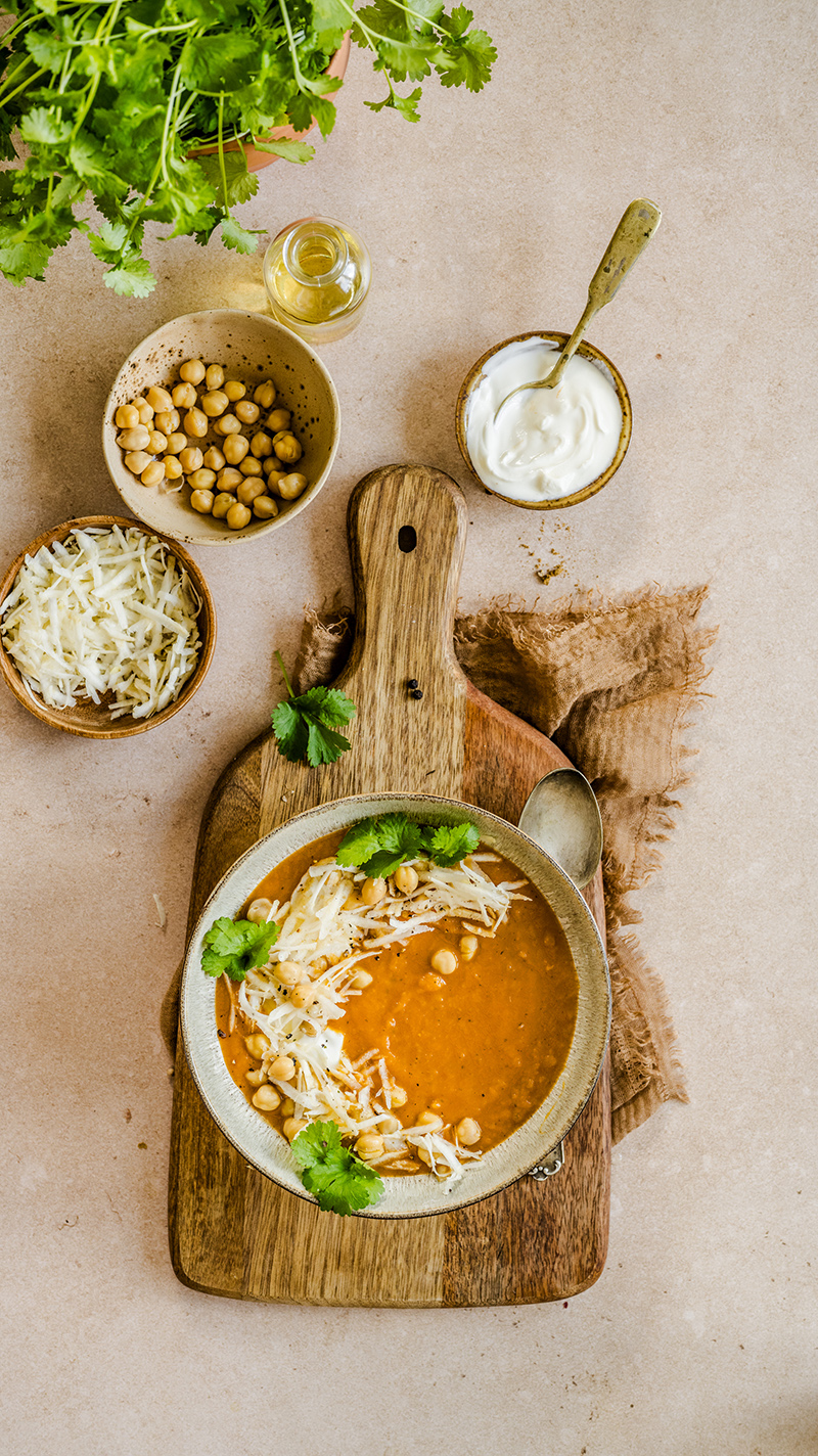 Cette soupe crémeuse aux pois chiches rôtis est non seulement délicieuse, mais elle offre également une excellente source de protéines végétales et de fibres.