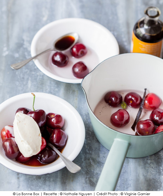 1• Équeutez les cerises et faites chauffer un litre d’eau avec le sucre, les épices et la gousse de vanille fendue. Dès ébullition, retirez les épices, ajoutez les cerises et éteignez le feu. Couvrez et laissez infuser pendant 20 minutes.