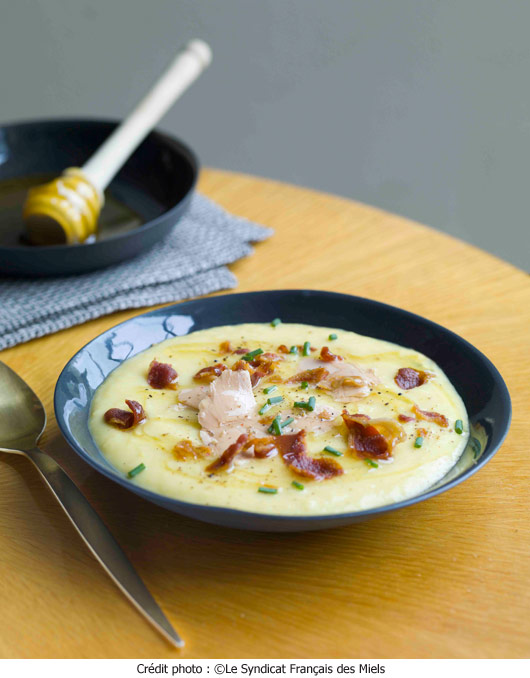Servez la soupe parsemée d’éclats de bacon, de copeaux de foie gras, de 2 cuillères à soupe de miel de Fleurs, de la ciboulette ciselée et un tour de moulin à poivre