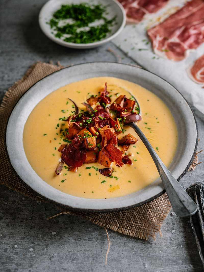 Servir la soupe et saupoudrer le tout de la patate douce, l’oignon et le Jambon de Parme croustillant.