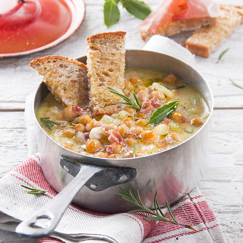 Servir la soupe de pois chiches avec des croûtons de pain grillés.