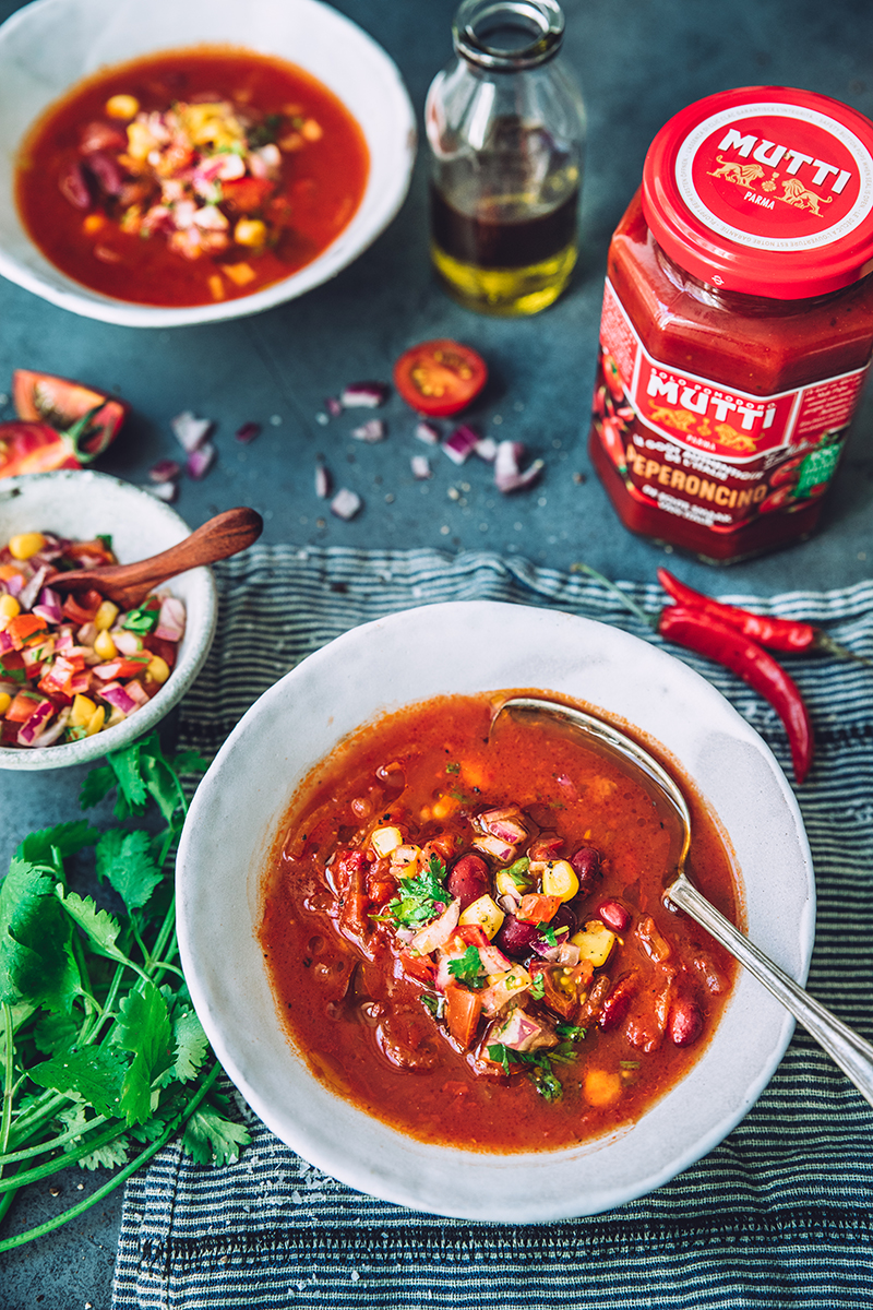 La soupe de tomates à la mexicaine est crémeuse et originale. Une recette de soupe pimentée composée d’épices et de légumes couramment utilisés dans la cuisine mexicaine, accompagnés de notre Sauce tomates et piments Mutti.