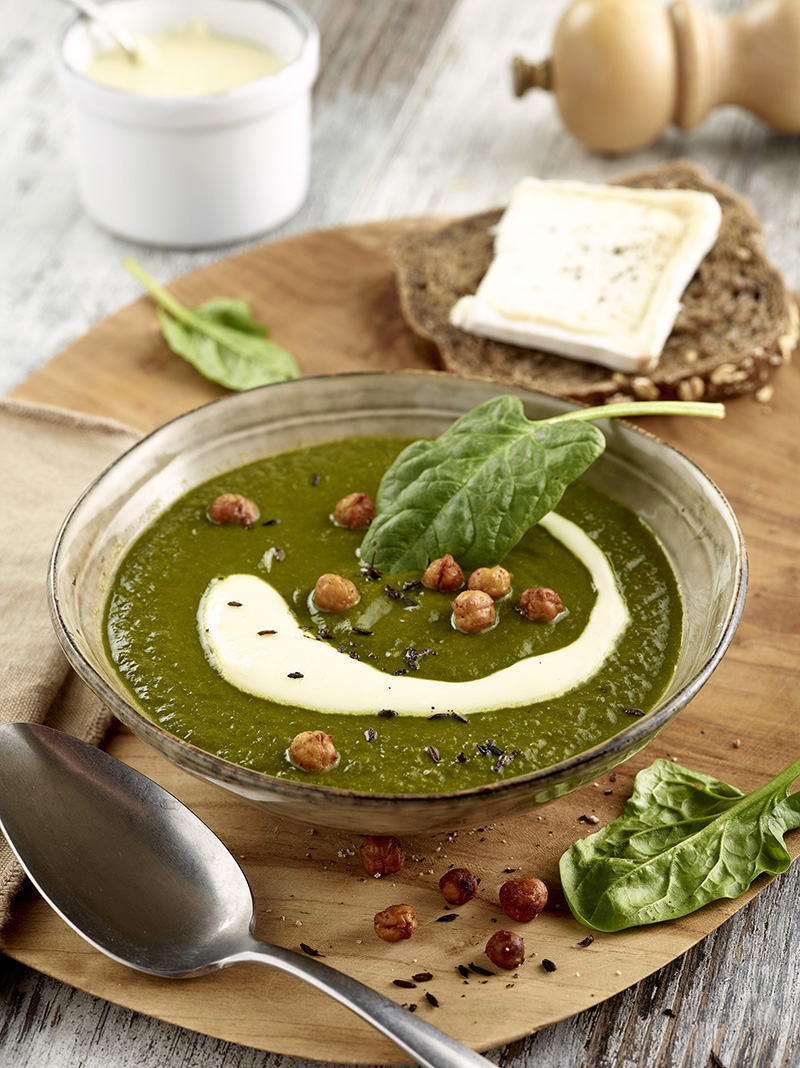 Soupe d’épinards, crémeux de Chaource et pois chiches au cumin