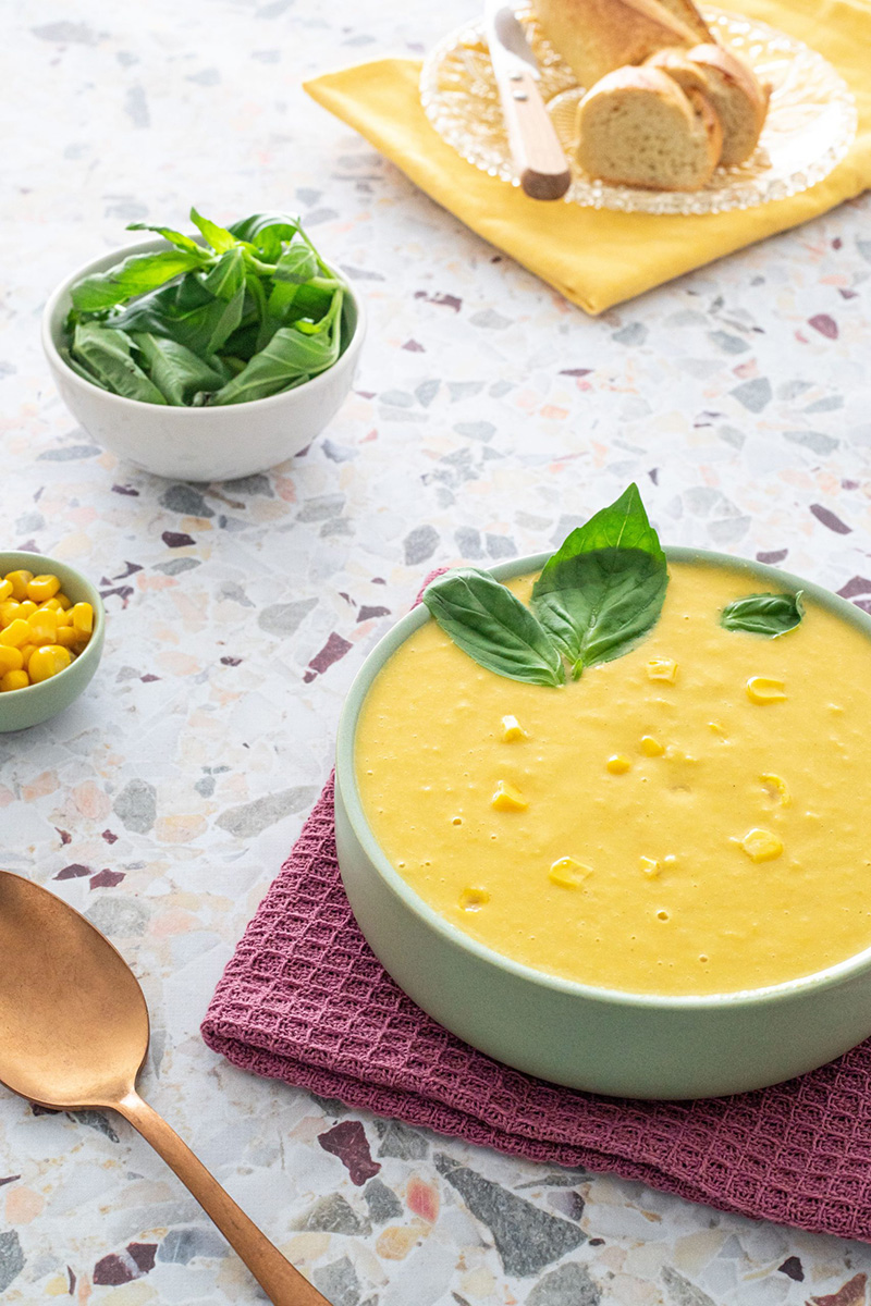 Verser dans les bols, ajouter un filet de crème fraîche, un peu de paprika, les grains de maïs entiers et quelques feuilles de basilic.