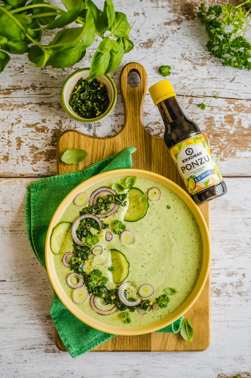 Cette recette de soupe froide aux légumes verts et au kéfir est servie froide, avec une bonne gremolata faite maison. Idéale lorsqu’il fait très chaud, elle convient même aux végétaliens.