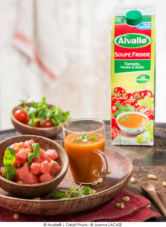Soupe froide Tomate, Menthe & Basilic Alvalle® et tartare de pastèque et pignons