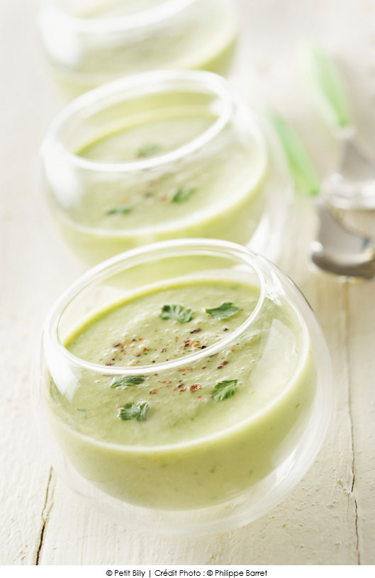 ②• Dans le bol d’un mixeur, verser les dés de concombres, le yaourt, le Petit Billy, l’huile d’olive, les herbes finement hachées et 4 glaçons.