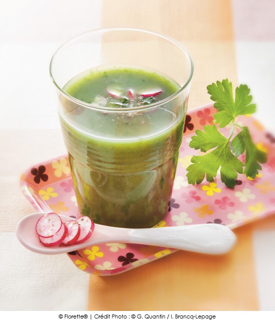 ③• Au moment de servir la soupe glacée, coupez les radis en lamelles. Répartissez la soupe dans 4 verres.