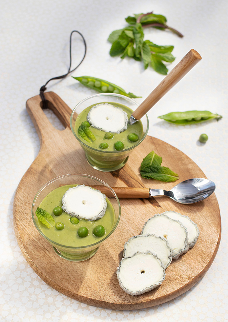 Soupe glacée de petits pois menthe au Sainte-Maure-de-Touraine AOP