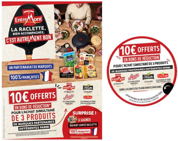 L’opération promotionnelle sera lancée dès le 25 octobre avec une mécanique très simple : 10 € offerts en bons de réduction pour l’achat simultané de trois produits parmi les 4 marques partenaires : Entremont, Aoste, Florette, Priméale. Dans le même temps, Entremont permettra également aux consommateurs de tenter de gagner, via les réseaux sociaux, 100 box spéciales soirée raclette 100% française d’une valeur de 46 €. En jeu : le kit complet d’une soirée raclette gourmande à souhait avec des produits Entremont, Aoste, Florette et Priméale !