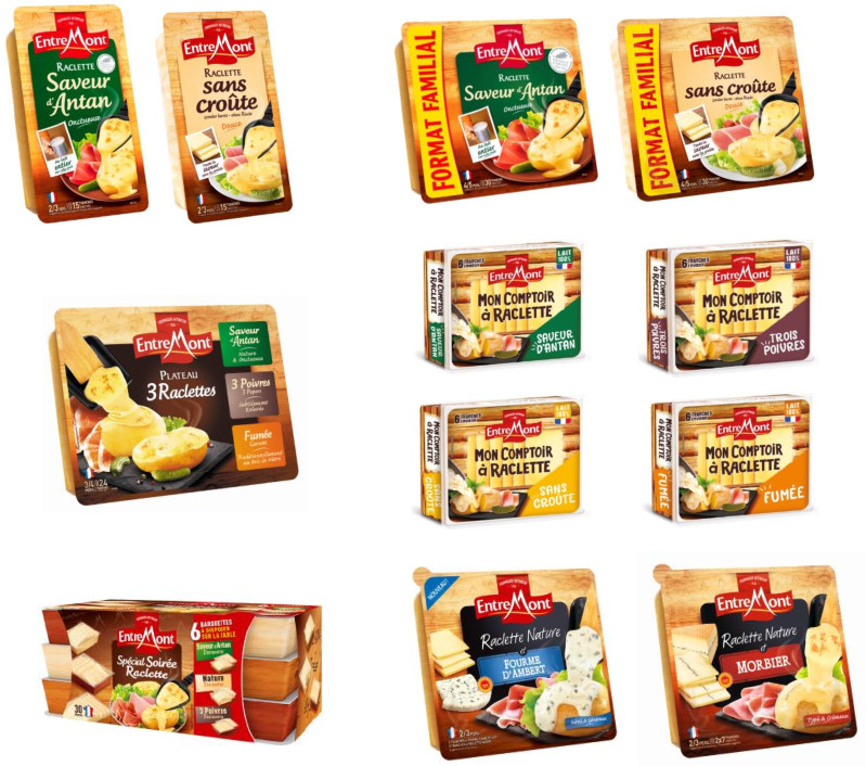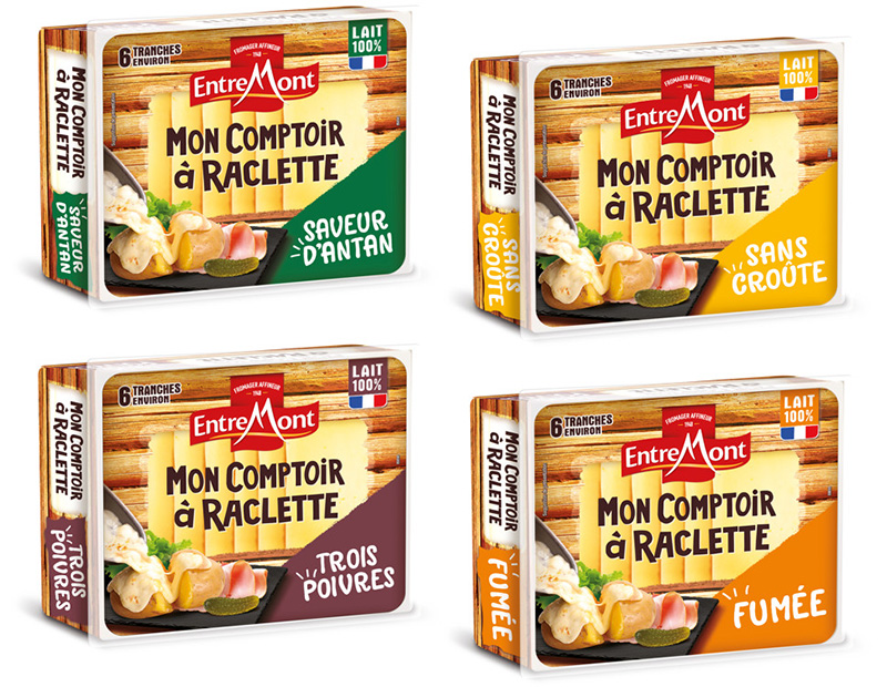 Cette année, pour faciliter le choix des consommateurs, Entremont a décidé de retravailler le décor de « Mon Comptoir A Raclette » pour faciliter l’identification des 4 variétés proposées en faisant une large place au nom de la saveur sur un fond de couleur très visible :