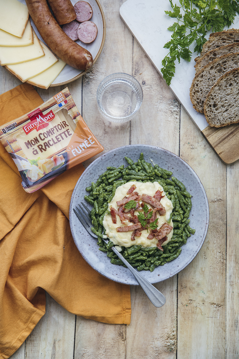 Spaetzle alsaciens aux épinards et crème de raclette « fumée » Entremont