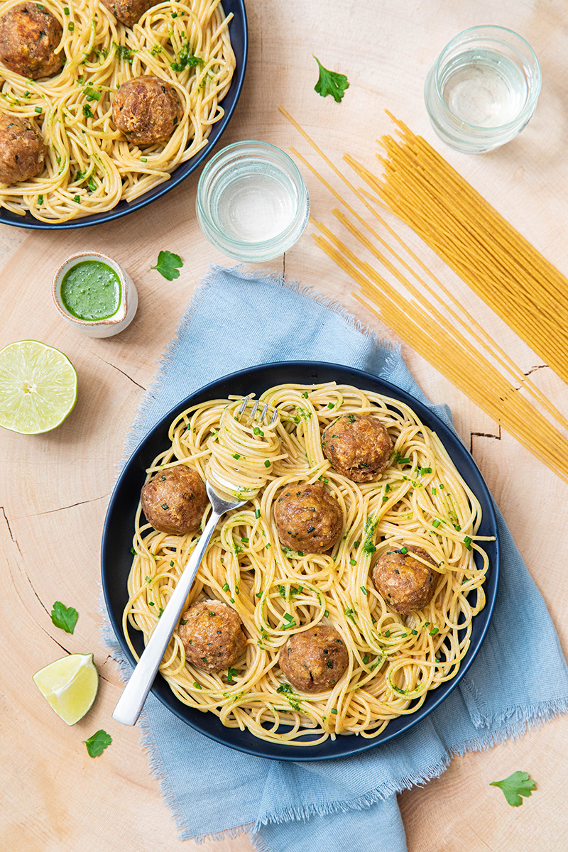 ⑤• Servez les spaghetti avec les boulettes en les arrosant de la sauce aromate citronnée.