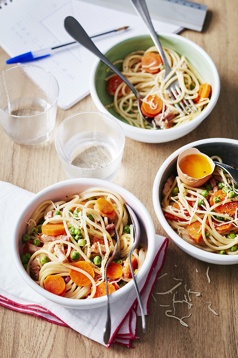 Mélanger les pâtes, les légumes et ajouter les lardons à la crème et servir bien chaud accompagné d’un jaune d’œuf et de fromage râpé !