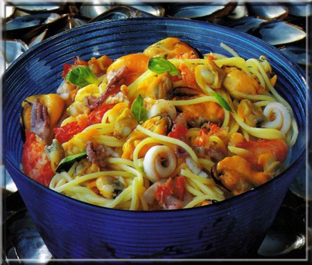 Égoutter les spaghettis, les verser dans un grand saladier, ajouter les fruits de mer, arroser d'une cuillère d'huile d'olive, poivrer et servir aussitôt.