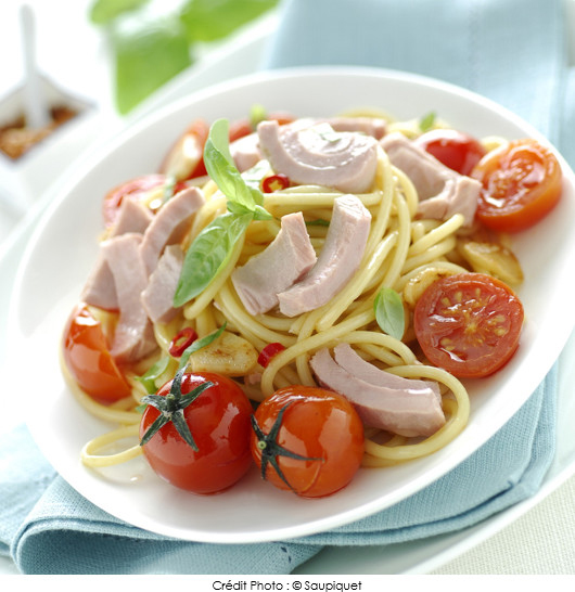 Un exemple ? Des spaghettis sautés avec du thon et des tomates cerise.