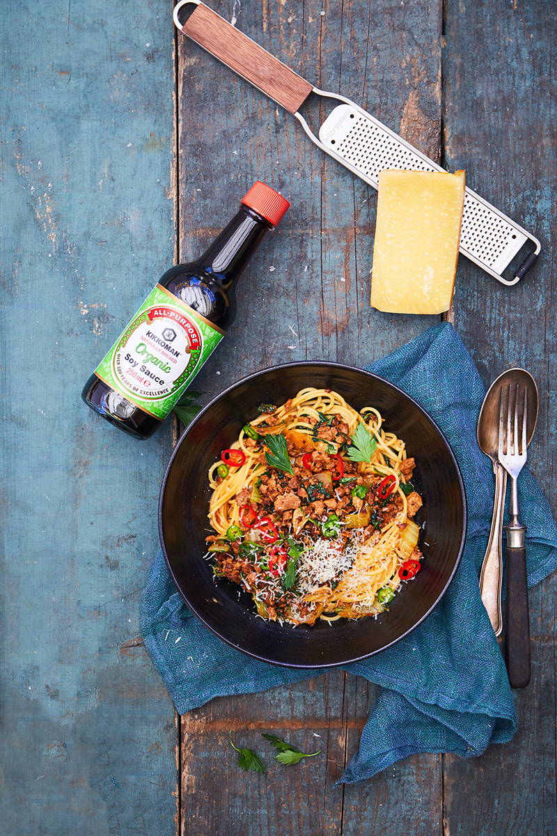 ③• Ajouter les légumes et faire cuire jusqu’à ce qu’ils soient à point. Ajouter la sauce soja bio naturellement fermentée Kikkoman, l’huile pimentée et les épices. Ajouter les spaghettis et bien mélanger.