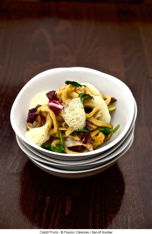 ⑥• Faites revenir les spätzles à la poêle dans du beurre. Salez. Servez les spätzles, accompagnées de feuilles de salade trévise et de pousses d’épinard revenues à l’huile d’olive avec une cuillère à café d’ail haché.