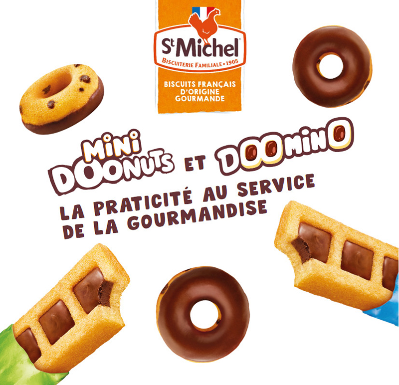 Lorsque St Michel met son savoir-faire au service de l’innovation des goûters, la promesse est tenue ! Praticité et originalité sont plus qu’au rendez-vous, à commencer par les DOOMINO, un tout nouveau format ludique et original de gaufre, à la texture moelleuse et aérée. La visibilité des 3 puits de chocolat façon pâte à tartiner (20% fourrage chocolat) appelle à la gourmandise, sans pour autant délaisser le côté pratique : garanti sans risque de chocolat sur les doigts, son emballage individuel fait de lui le compagnon idéal de toutes les pauses. Une nouveauté inédite, proposée en version chocolat ou choco noisette.