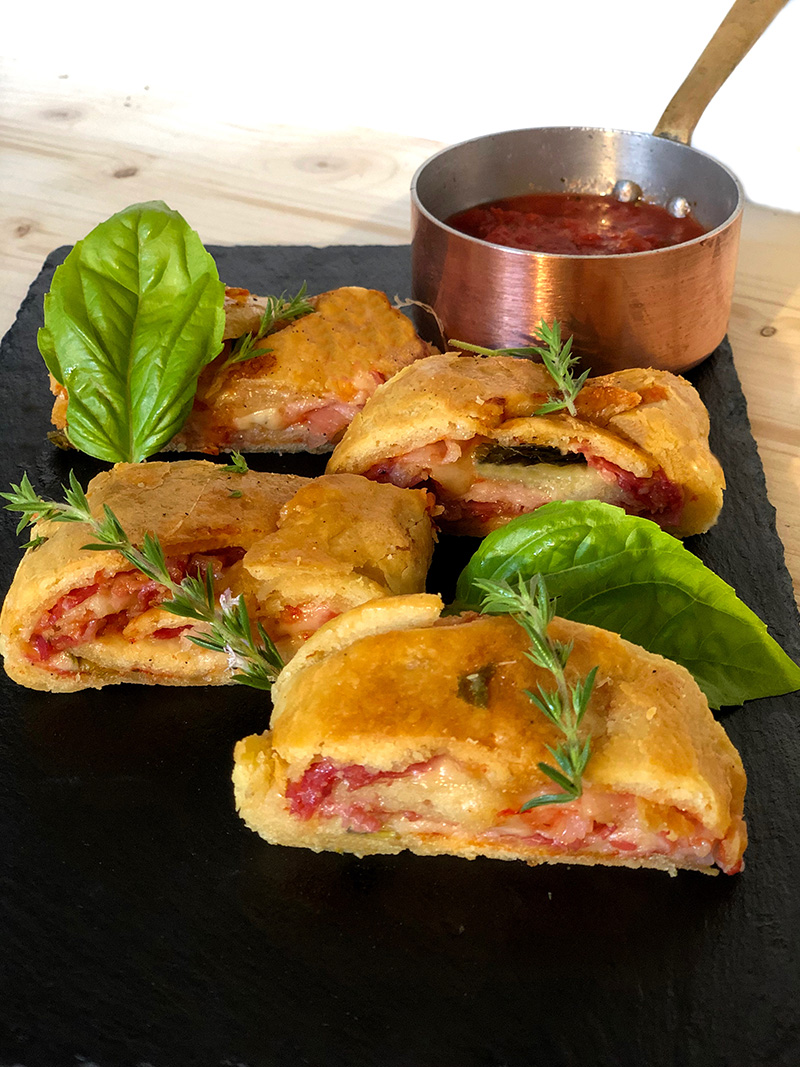 ⑤• Enroulez votre pâte dans sa longueur et pincez les bords pour rendre le Stromboli hermétique.