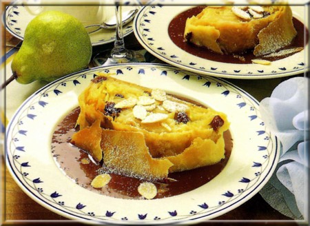 Couper le strudel en tranches. Parsemer de sucre glace et des amandes restantes. Servir avec la sauce chocolat