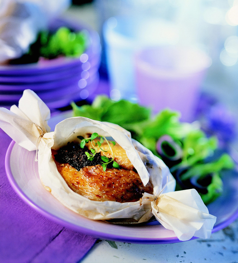 ③• Au centre d'une feuille, disposer une cuillerée de tapenade. Disposer un morceau de pintade. Ajouter à nouveau une cuillerée de tapenade. Terminer par deux brindilles de thym. Vous pouvez aussi décoller la peau de la viande sans la percer et glisser la tapenade entre chair et peau !