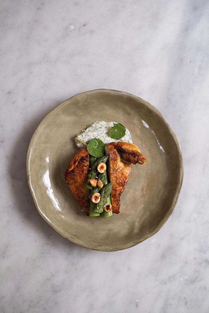 Suprême de pintade fermière Label Rouge asperges vertes au lard fumé, vinaigrette balsamique, noisettes et câpres