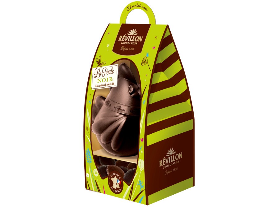 Forme iconique de moulage revisité avec modernité, la poule transportera les aficionados du chocolat. Chocolat noir ou au lait, ce format généreux garni de petits œufs est idéal pour que petits et grands puissent se régaler ! Ce moulage attirera facilement l’œil des gourmands qui brandiront fièrement leurs trésors chocolatés.