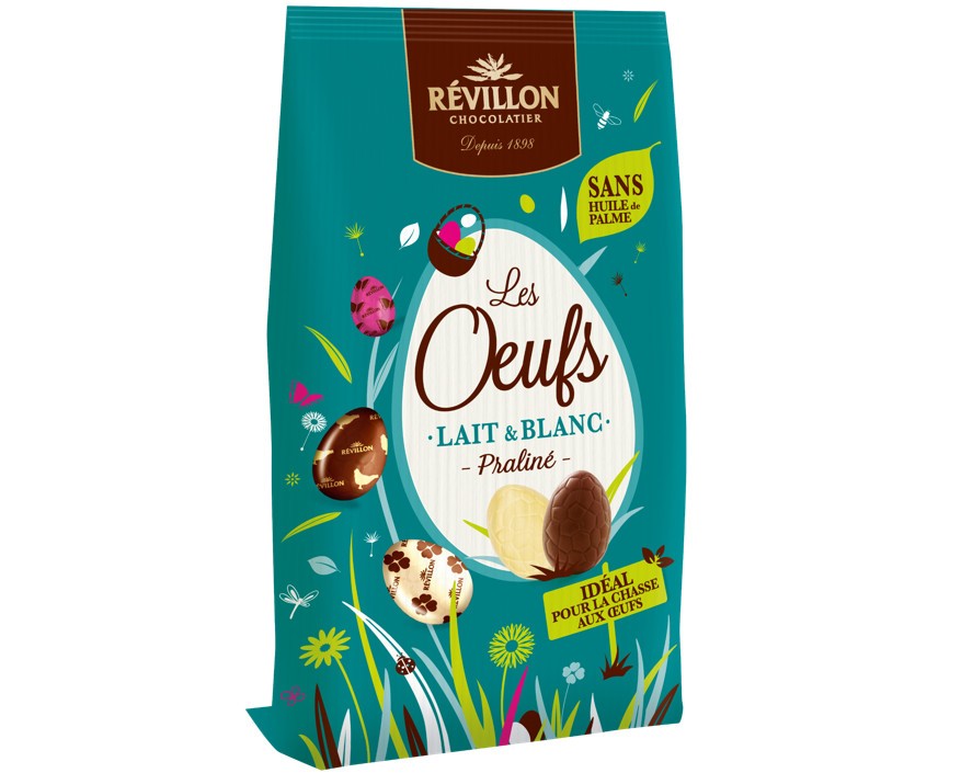L’alliance du savoir-faire et de la qualité de Révillon Chocolatier a donné naissance à une gourmandise idéale pour la chasse aux œufs, alliant plaisir des petits et grands et respect de l’environnement : Les Œufs Lait & Blanc praliné. Elaborés sans huile de palme et présentés dans un emballage 100% recyclable, ces petits œufs enchanteront la chasse aux œufs des gourmands tout en respectant l’environnement !