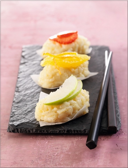 A l’aide de petits carrés de papier sulfurisé, former des sushis de riz, décorer avec des lamelles de fruits et déguster aussitôt.