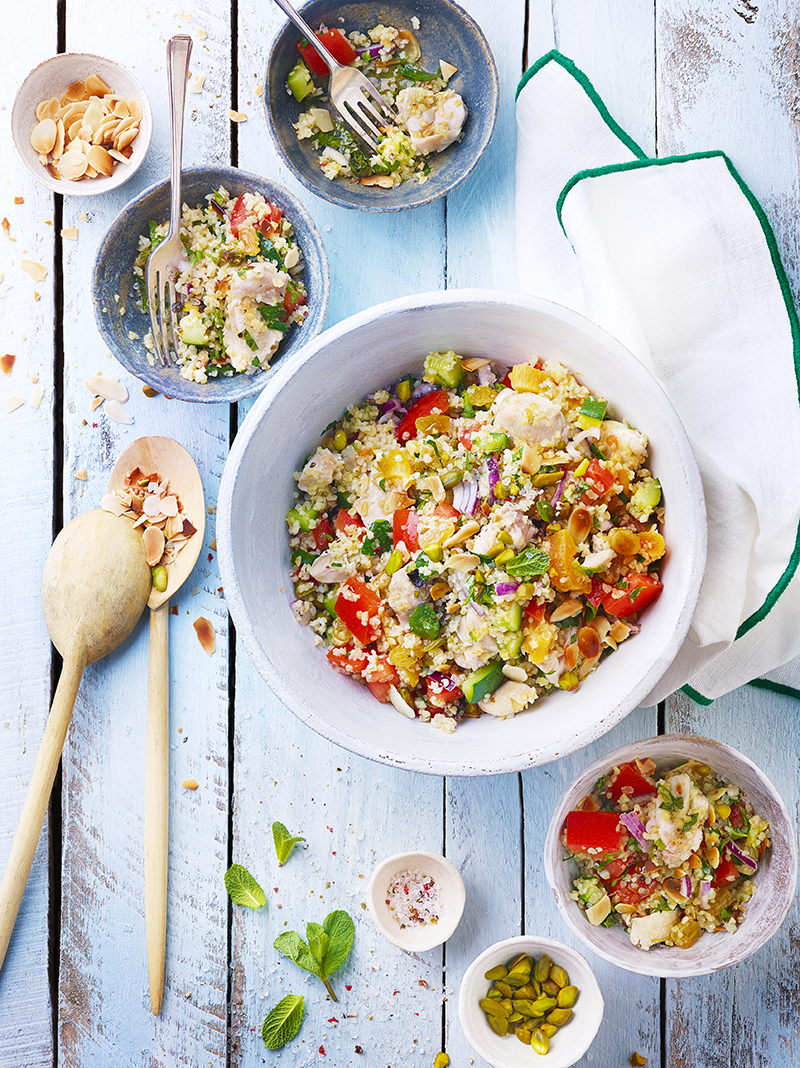 On reprend les bases de la recette classique, et on y ajoute quelques fruits secs supplémentaires, un peu de courgettes, et surtout une bonne dose de lapin. Une recette estivale qui apporte tous les bons nutriments, composée d’ingrédients de saison, et simple à réaliser : en 25 minutes maximum, c’est prêt ! La viande de lapin s’accorde parfaitement à la menthe et au persil, pour un repas riche en saveurs et haut en couleurs.