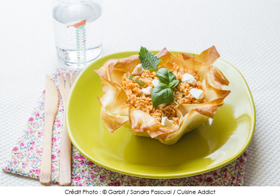 ②• Pendant ce temps coupez les feuilles de pâte filo en 2 et badigeonnez-les de beurre fondu. Repliez chaque demi-feuille en deux et badigeonnez à nouveau. Superposez 3 demie-feuilles dans des moules puis enfournez pendant quelques minutes à 200°C (th.6-7) jusqu’à ce qu’elles soient dorées et croustillantes.