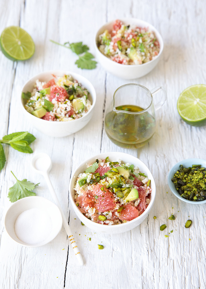 Taboulé de chou-fleur au pamplemousse, avocat, coriandre, menthe, pistaches