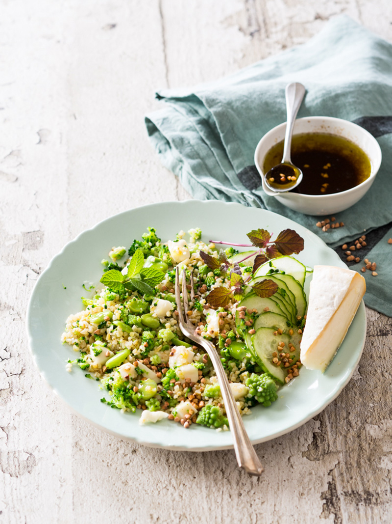 ⑥• Servez la salade avec quelques rondelles de concombre, des dés de Reblochon, parsemez de graines de kasha.