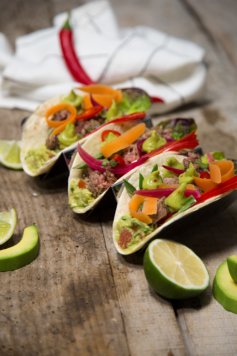 Ces tacos ont le sens de la fête, ils ne devraient pas tarder à être dévorés, tant leurs belles couleurs et leurs saveurs caliente savent faire décoller l’ambiance brûlante.