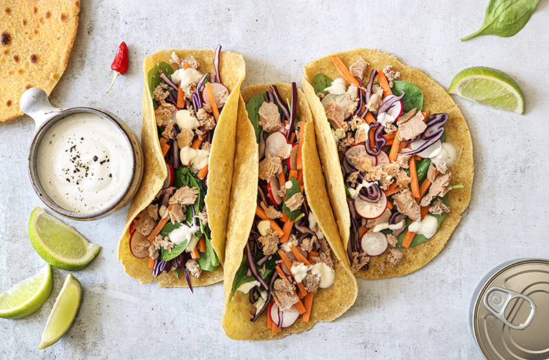 ⑤• Préparer les tacos en garnissant chaque tortillas de thon, crudités de printemps, sauce au yaourt et d’un filet de citron vert.