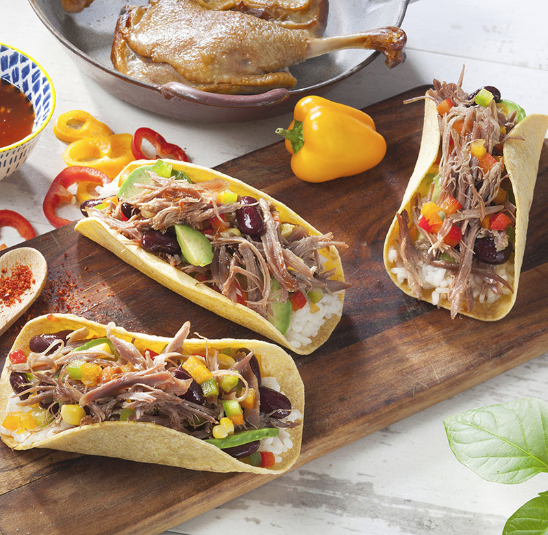 Explosion de saveurs Tex-Mex avec ce confit de canard effiloché, accompagné de riz, haricots rouges, poivrons grillés, avocat et sauce piquante, le tout dans des tacos moelleux à la farine de maïs.