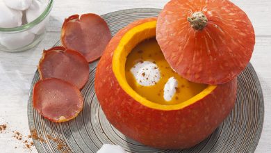 Velouté de potimarron, glaçons au lait de coco et chips de bacon