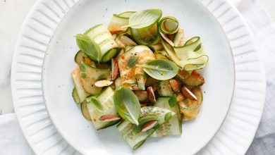 Concombres de France en tagliatelles et pesto au piment, miel et amandes