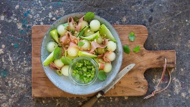 Finger de melon, lamelles de concombre et Jambon cru Aoste