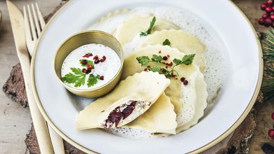 Ravioles, courgettes poêlées, sauce fromage blanc et jambon cru Aoste